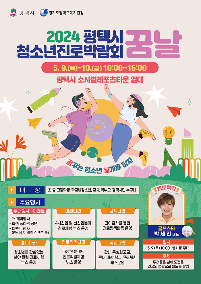 평택시(시장 정장선)는 청소년들의 미래설계 지원을 위한 다양한 진로 체험 축제인 2024 평택시 청소년진로박람회 ‘꿈날’을 오는 9일부터 10일까지 2일간 소사벌레포츠타운 일대에서 개최한다.