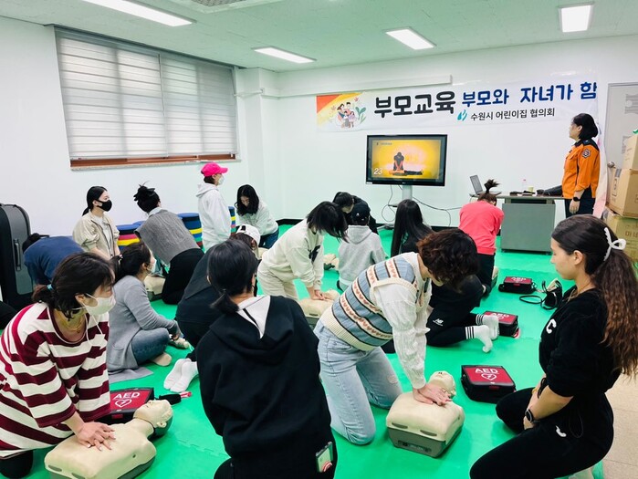 수원소방서에서 열린 교육에서 학부모들은 심폐소생술과 교육프로그램 기초과정 이론을 배우고, 가슴압박 소생술과 자동심장충격기 사용법을 실습했다. 수원시 어린이집협의회는 교육 수료자에게 심폐소생술 교육 수료증을 수여했다.