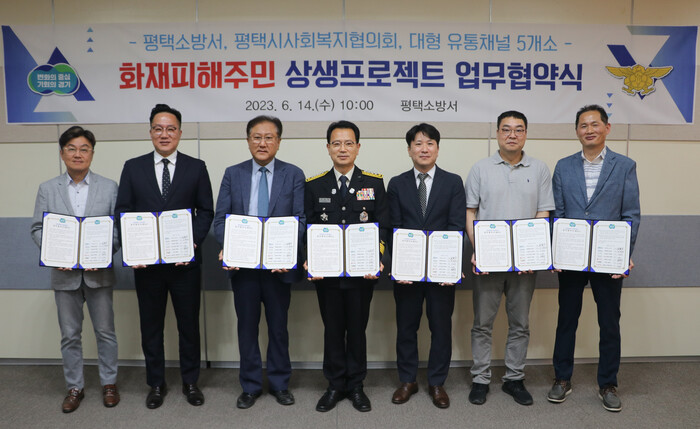 평택소방서는 지난 14일 평택시사회복지협의회(평택행복나눔본부)와 관내 대형유통채널(AK플라자 평택점, 뉴코아울렛 평택점, 롯데마트 평택점, 이마트 평택점, 홈플러스 평택안중점) 5곳과 ‘화재피해주민 상생프로젝트’ 업무 협약을 체결했다.