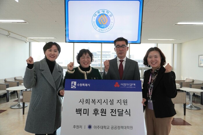 14일 아주대학교 공공정책대학원(영통구 원천동)에서 열린 전달식에는 권혁성 공공정책대학원장, 박란자 수원시 복지여성국장, 수원시사회복지협의회 이미연 사무국장 등이 참석했다.