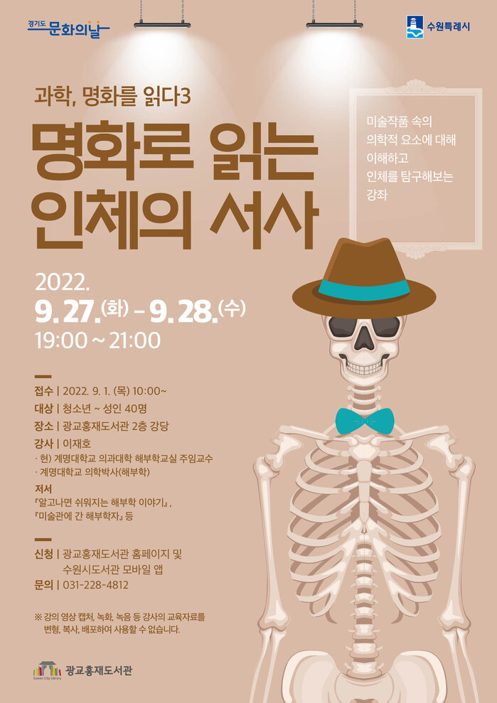 수원시 광교홍재도서관이 ‘과학, 명화를 읽다 3: 명화로 읽는 인체의 서사’ 수강생 40명을 9월 1일 오전 10시부터 모집한다.