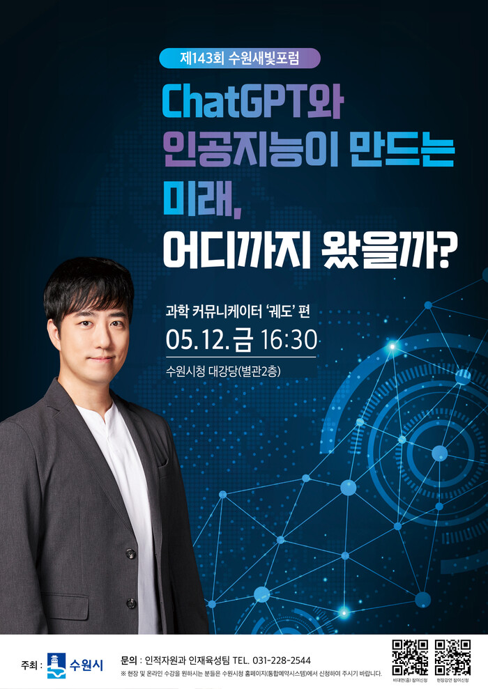 수원시는 5월 12일 오후 4시 30분 시청 대강당에서 ‘챗지피티(ChatGPT)와 인공지능(AI)이 만드는 미래, 어디까지 왔을까?’를 주제로 ‘제143회 수원새빛포럼 과학커뮤니케이터 궤도 편’을 개최한다.