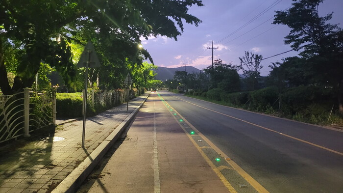 반딧불이 화장실에서 상광교동 노인회관에 이르는 자전거전용차로 3.7km에 태양광 도로표지병 태양광 도로표지병 : 태양광으로 주간 시 충전되고 야간 시 자동 점등되는 방식으로서 친환경 시설물