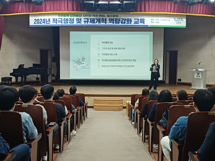 남양주시(시장 주광덕)는 29일 소속 공무원 및 남양주도시공사 직원 등 250여 명을 대상으로 ‘2024년 적극행정 및 규제개혁 역량 강화 교육’을 실시했다.