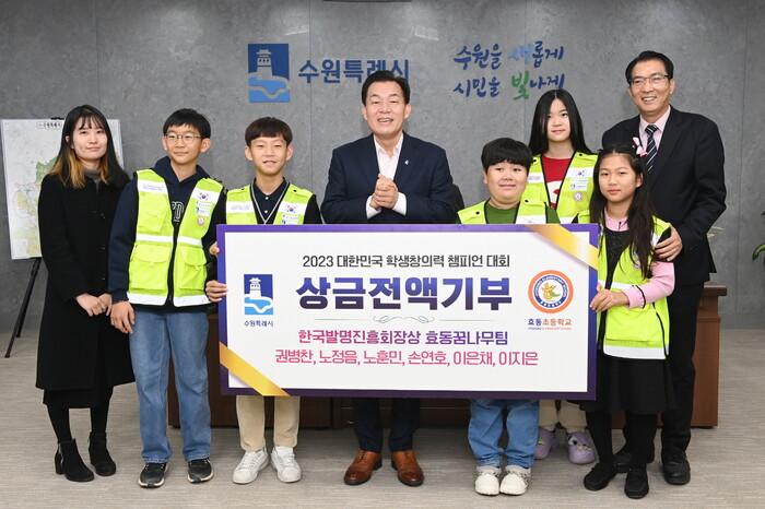 ‘2023 대한민국 학생창의력 챔피언대회’에서 장려상을 받은 수원 효동초등학교 효동 꿈나무팀이 “관내 취약계층에 전달해 달라”며 상금 전액(20만 원)을 수원시에 기부했다.