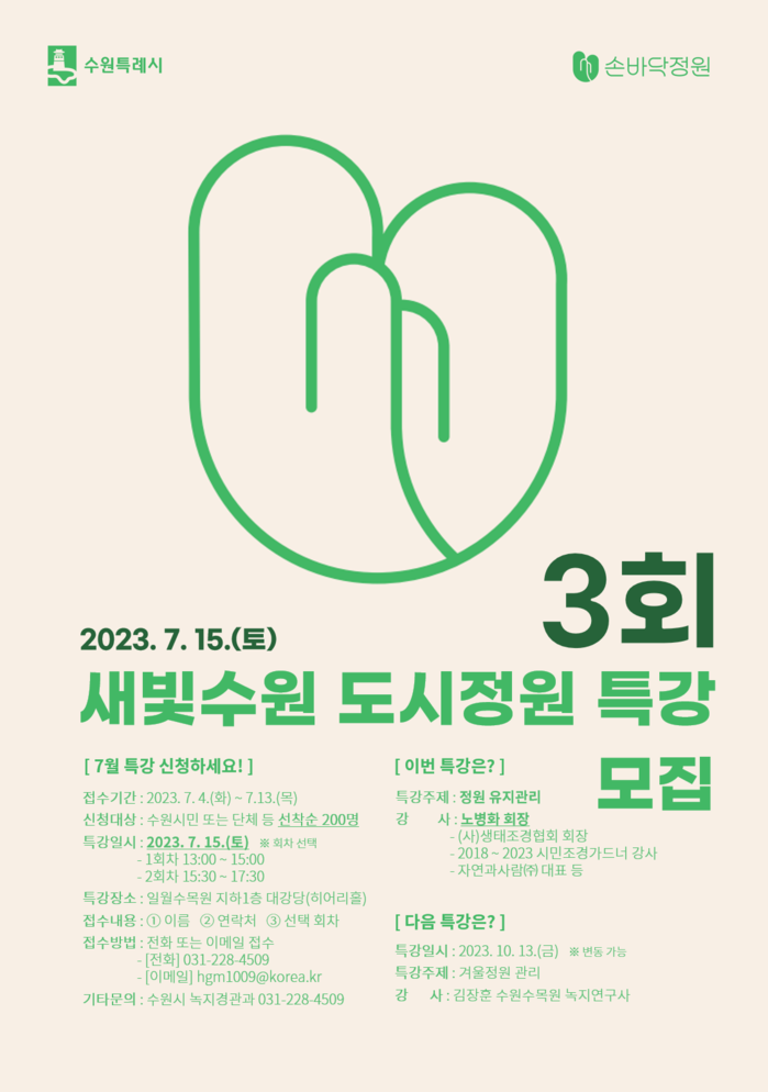 수원시가 ‘2023년 도시정원 특강’ 3회차 참여자를 7월 13일까지 선착순으로 모집한다.