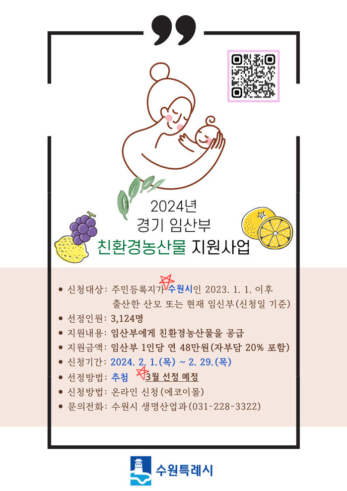 수원시는 ‘2024년 경기임산부 친환경 농산물 지원사업’에 참여할 임산부 3124명을 2월 29일까지 모집한다.