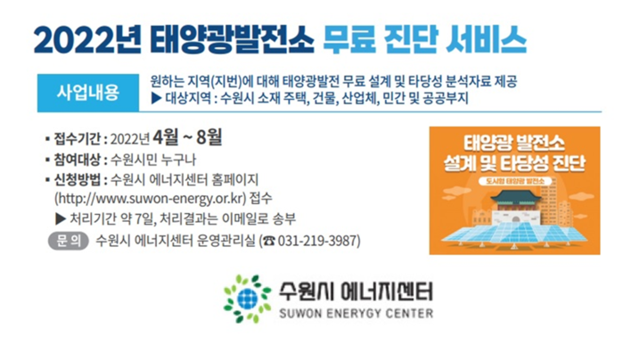 수원시에너지센터가 8월까지 시민을 대상으로 ‘2022년 태양광 발전소 무료 진단 서비스’를 운영한다.