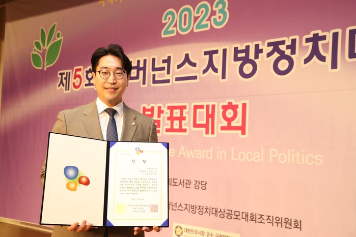 김도현 안양시의원(민주당, 평촌.평안.귀인.범계.갈산)이 지난 24일 국회도서관에서 개최된 ‘2023 거버넌스지방정치대상’에서 우수상을 수상했다.