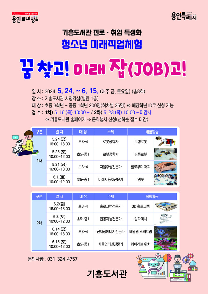 용인특례시 기흥도서관은 청소년을 대상으로 4차 산업과 관련된 7개 직업군을 체험하는 ‘꿈 찾고! 미래 잡(JOB)고!’ 청소년 미래직업체험 프로그램을 운영한다고 13일 밝혔다.