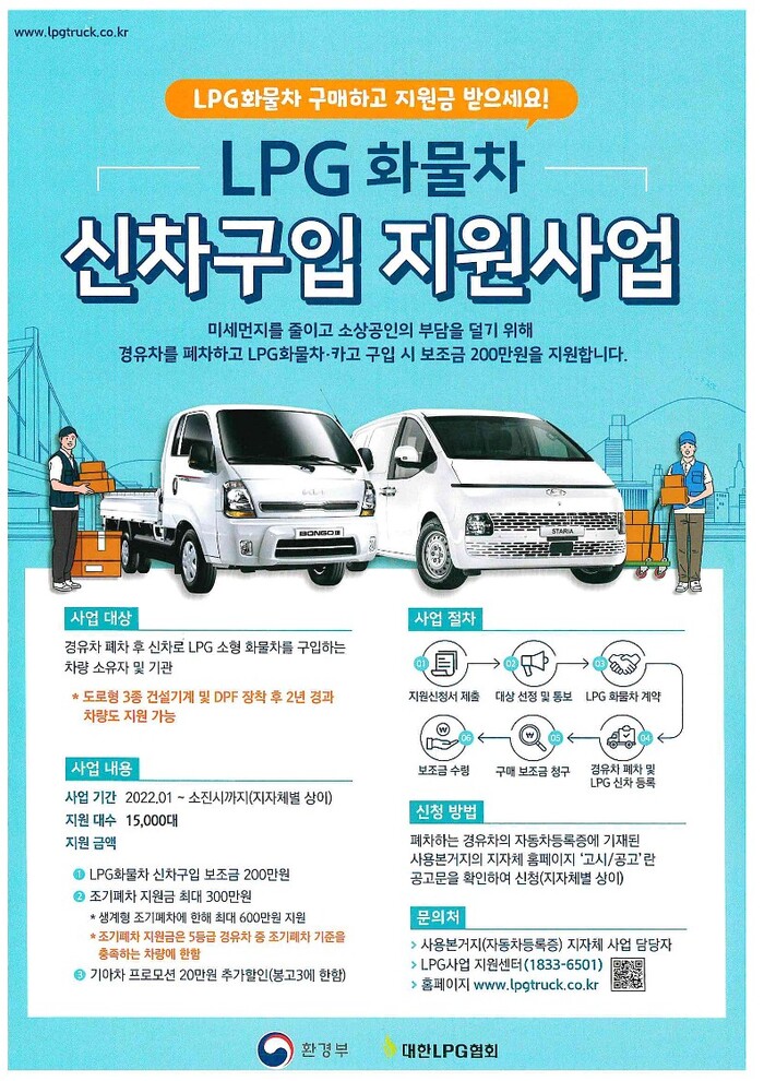 특히 5등급 경유차를 조기폐차 할 경우 조기폐차 보조금 최대 300만원과 LPG 화물차 신차 보조금 200만원을 지원받아 최대 500만원 혜택을 받을 수 있다.