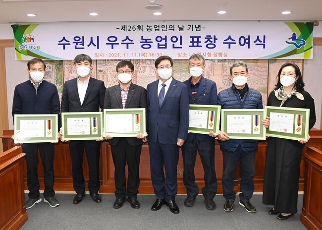 수원시가 제26회 농업인의 날(11월 11일)을 기념해 수원시 농업발전을 위해 노력한 수원 농업인 6명에게 수원시장 표창을 수여했다.