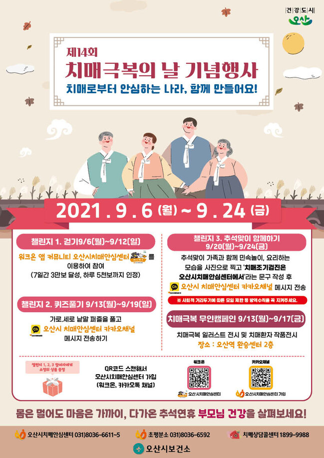이에 오산시보건소 치매안심센터에서는‘치매로부터 안심하는 나라, 함께 만들어요!’슬로건 아래 치매국가책임제 4주년을 기념하고 치매 극복을 위한 범국민적 공감대를 형성하기 위해 치매극복의 날을 시민들에게 적극 홍보할 예정이다.