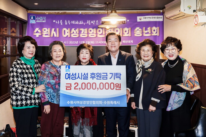 수원시 여성경영인협의회는 5일 권선동 한 음식점에서 열린 수원시 여성경영인협의회 2023년 송년 행사에서 이재준 수원특례시장에게 후원금을 전달했다. 수원시는 후원금을 관내 여성 폭력피해자 보호시설 지원에 사용할 예정이다.