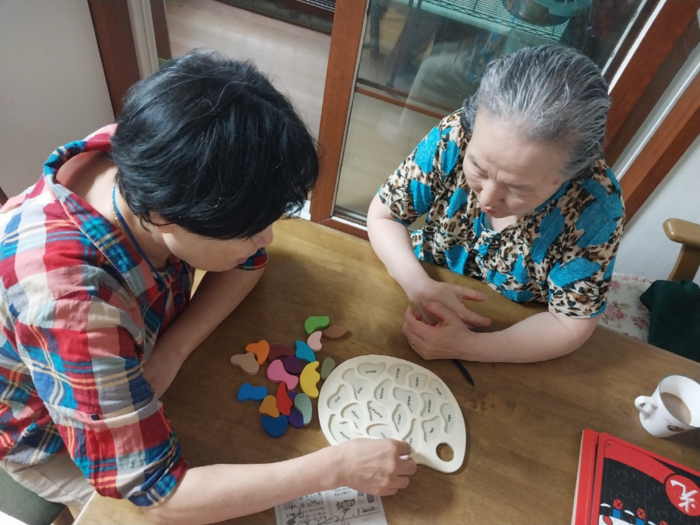 사진/치매길벗 활동가가 어르신과 인지활동을 하고 있다.(사진제공=수원시)