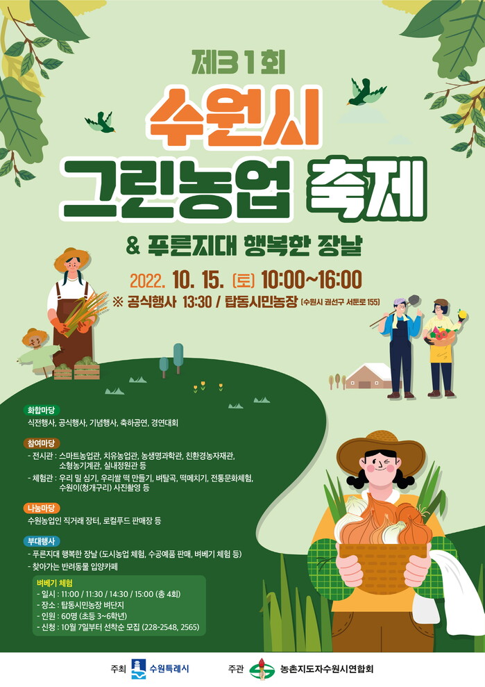 ‘제31회 수원시 그린농업축제’가 15일 오전 10시부터 오후 4시까지 탑동시민농장에서 열린다.