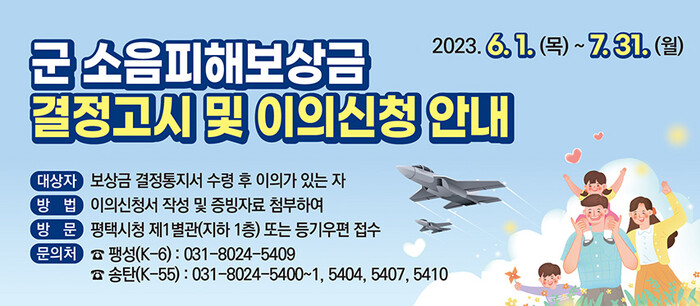 이번 소음 피해보상 대상은 평택 비행장(K-6), 오산 비행장(K-55) 소음 대책 지역에 주민등록지를 두고 실제 거주하는 지역주민으로, 보상 기간은 2022년 1월 1일부터 2022년 12월 31일까지이다.