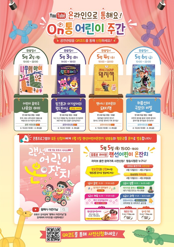 온(on)통어린이주간은 5월 2일부터 6일까지 유튜브를 통해 문화공연을 즐길 수 있는 랜선프로그램으로 ▶(5.2.)나무의 아이 ▶(5.3.)핑크퐁과 아기상어의 월드투어쇼(선착순 300명) ▶(5.4.)가족뮤지컬 돼지책 ▶(5.5. 15:00)랜선어린이 온잔치 ▶(5.6.)허풍선이 극장의 비밀 등을 마련했으며 사전신청을 통해 즐길 수 있다.