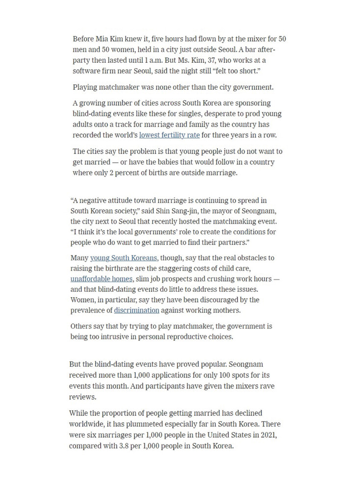 NTY는 2021년 미국에서 인구 1000명당 6쌍이 결혼했지만 한국은 1000명당 3.8쌍만 결혼하는 데 그치고, 2022년 한국 출산율은 7년 연속 감소해 0.78명을 기록했다면서 성남시를 비롯한 한국 여러 도시의 미혼남녀 만남 행사 사례를 전했다.