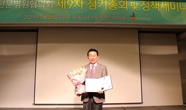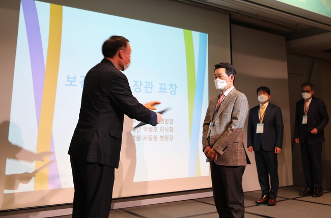 사진/ 자생의료재단 박병모 이사장이 대한전문병원협의회 정기총회서 보건복지부 장관 표창을 수여 받고 있다(사진제공=자생한방병원)
