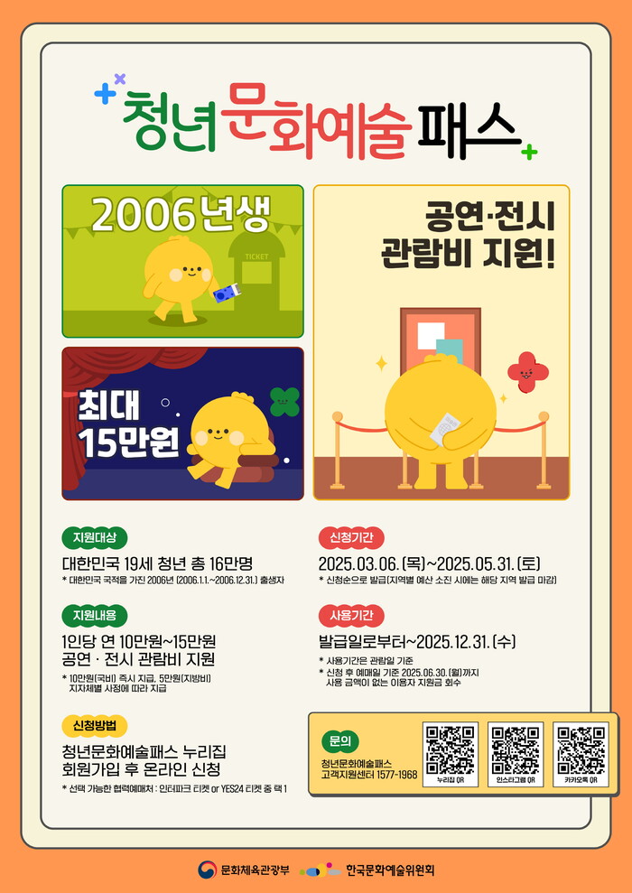 청년문화예술패스 홈페이지(https://youthculturepass.or.kr)에서 5월 31일까지 발급받고, 12월 31일까지 사용하면 된다.