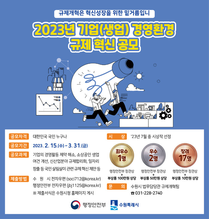 수원시는 행정안전부와 공동으로 ‘2023년 기업(생업) 경영환경 규제 혁신 공모전’을 진행, 오는 3월31일까지 제안을 접수받는다.
