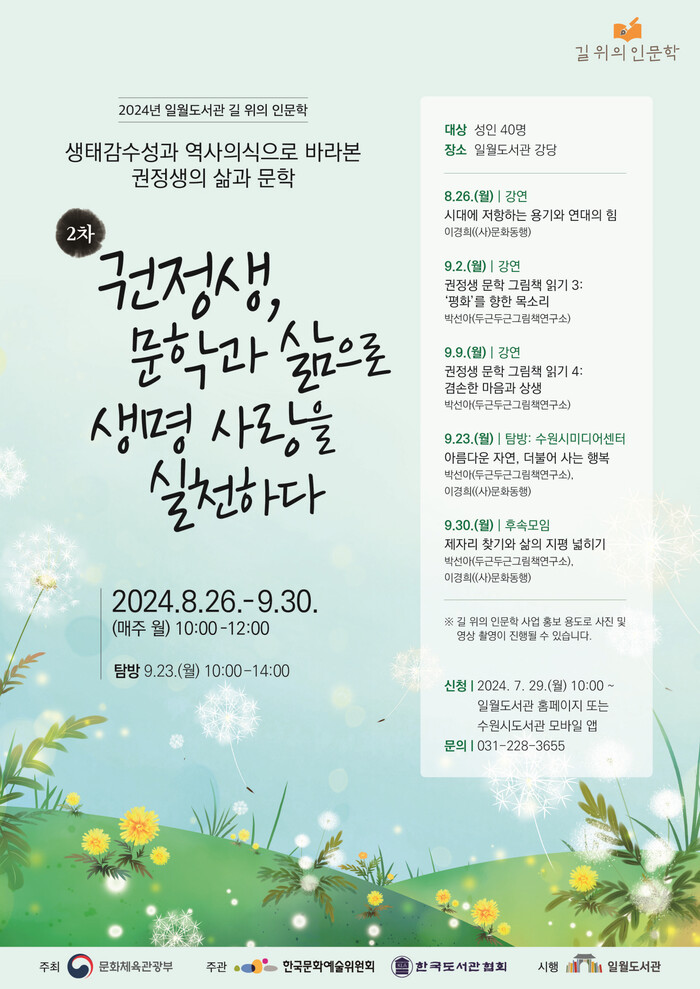 수원시 일월도서관은 문화체육관광부가 주최하고 한국문화예술위원회와 한국도서관협회에서 주관하는 ‘2024년 길 위의 인문학’ 사업에 선정됐다. 지난 6월, 1차 강의로 ‘권정생, 역사의식과 생명 존중의 마음을 담다’를 진행했다.