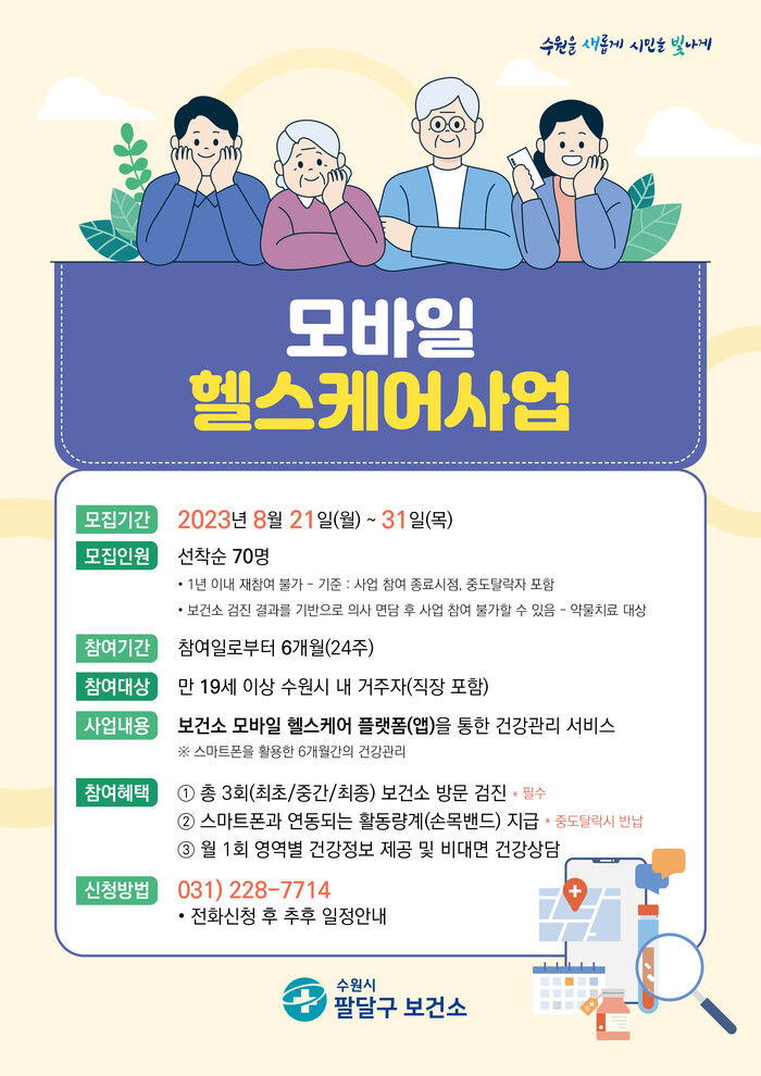 수원시 팔달구보건소가 모바일 헬스케어 사업에 참가할 만 19세 이상 수원시민 70명을 모집한다.