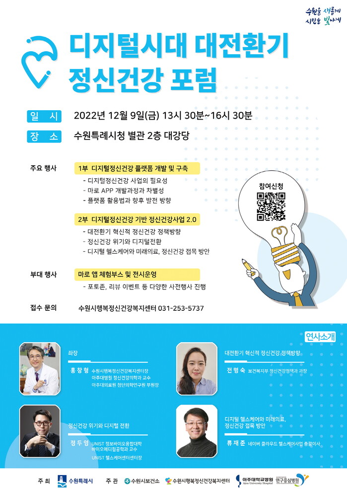 수원시가 12월 9일 오후 1시 30분 시청 대강당에서 ‘디지털시대 대전환기 정신건강 포럼’을 개최한다.