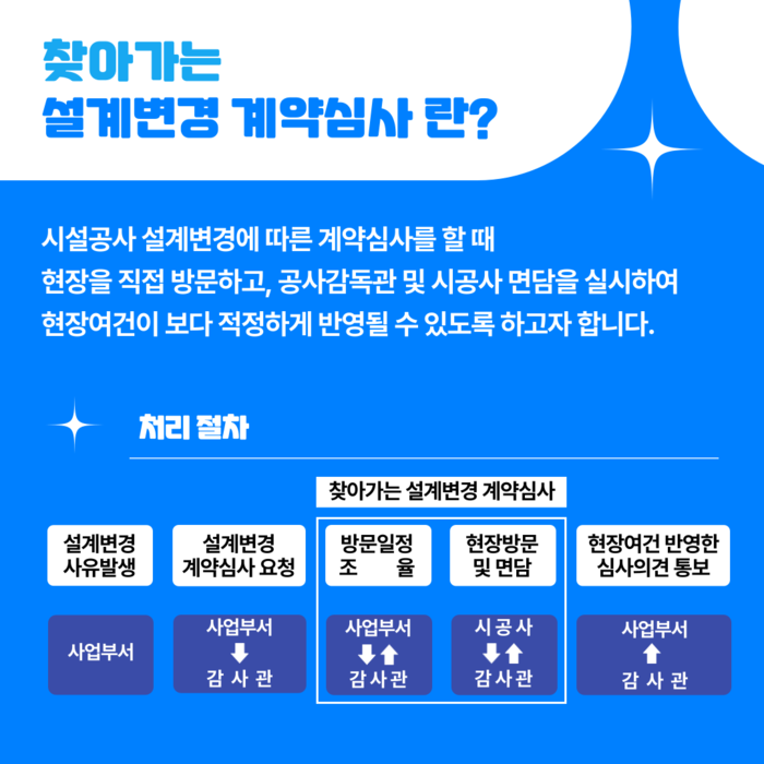 ‘찾아가는 설계변경 계약심사’는 시설 공사 설계변경으로 계약심사가 필요할 때 감사관이 현장을 방문해 현장 여건이 적정하게 반영됐는지 여부 등을 심사하는 것이다.