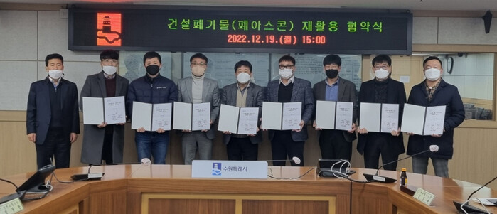 수원시는 19일 수원시청에서 폐아스콘 재활용처리업체 7개 사와 ‘폐아스콘 재활용 협약’을 체결하고, 관내에서 발생하는 폐아스콘 처리에 협력하기로 했다.