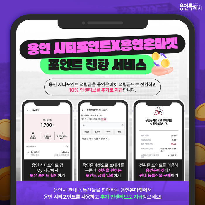 용인특례시(시장 이상일)는 민간 카드 포인트를 지역화폐(용인와이페이)로 바꿔주는 ‘용인 시티포인트’ 앱에 ‘용인온마켓’ 적립금 전환 기능을 추가했다고 1일 밝혔다.