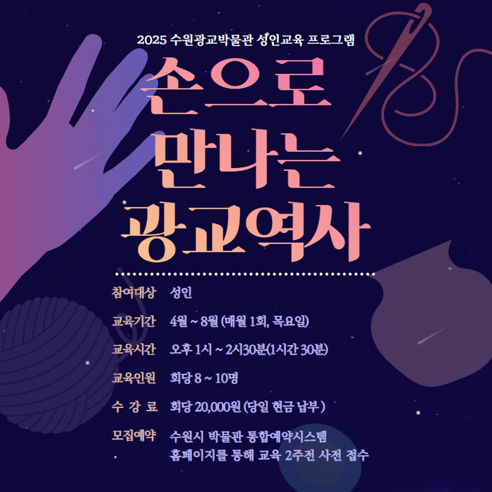 수원광교박물관 관계자는 “‘손으로 만나는 광교역사’는 전통적 주제를 현대적으로 재해석하고, 지역 공방과의 협업으로 창작의 가치를 재발견하는 프로그램”이라며 “많은 분이 함께해 새로운 문화를 체험하는 즐거움을 얻길 바란다”고 말했다.