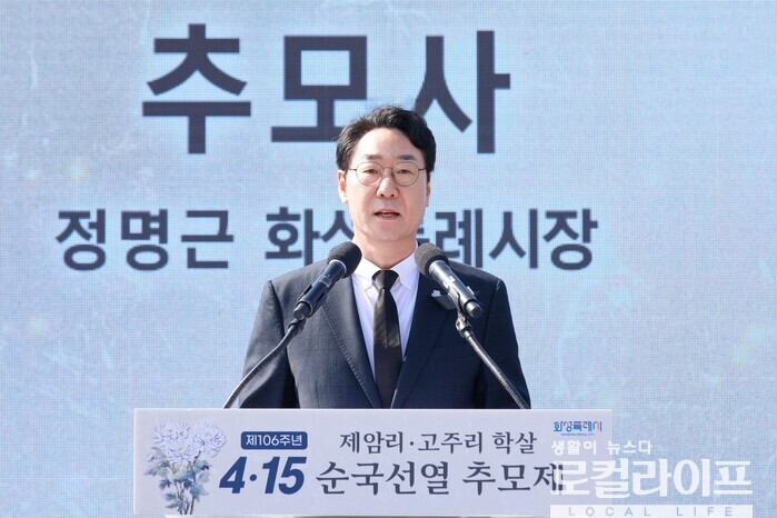 | ▲ 정명근 화성특례시장이 ‘제106주년 제암리·고주리 학살/4·15 순국선열 추모제’에서 추모사를 하고 있다. (사진출처=정명근 페이스북) |