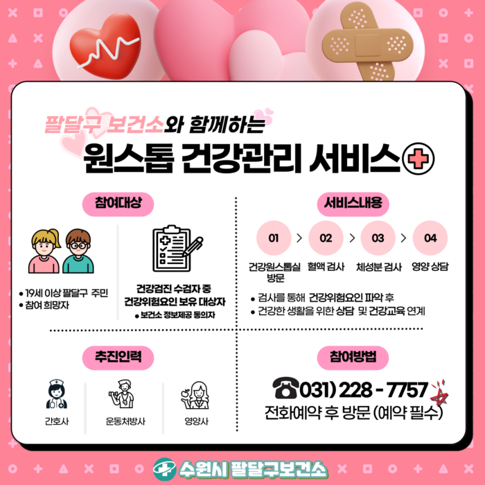 수원시 팔달구보건소가 19세 이상 팔달구 주민을 대상으로 건강 검사와 건강관리 교육을 해주는 ‘원스톱 건강관리 서비스’를 운영한다.