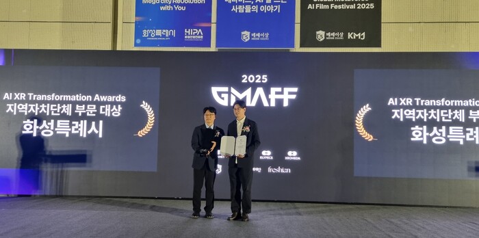 화성특례시(시장 정명근)가 20일 서울 코엑스에서 열린 코리아메타버스저널(KMJ) 주관 ‘2025 AI XR Transformation Award’ 시상식에서 지역자치단체 부문 대상을 수상하며 디지털 행정 선도 도시로서의 위상을 다시 한번 입증했다.