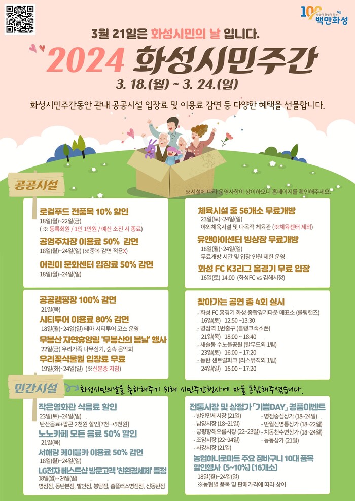 화성시(시장 정명근)가 ‘화성시 시민의 날’을 맞아 18일부터 24일까지 ‘화성시민주간’을 운영하고 관내 공공시설 이용에 감면 혜택을 제공한다. 올해부터는 혜택이 대폭 늘어난다.