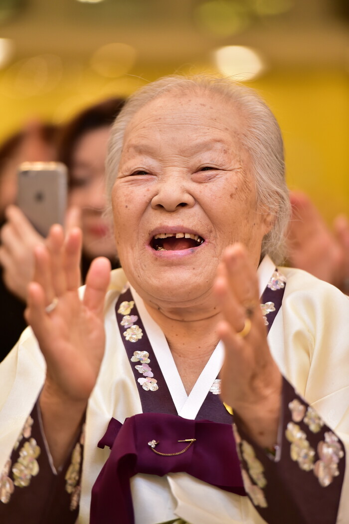 사진/2017년 12월 열린 구순연에서 안점순 할머니가 환하게 웃고 있다.(사진제공=수원시)