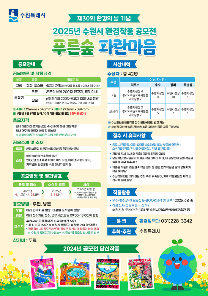 4월 1일부터 25일까지 그림(회화, 포스터)과 글짓기(운문, 산문) 2개 부문 환경 작품을 공모한다. 수원시 4~6세 미취학아동(그림 부문만 응모 가능), 초·중·고등학교 학생, 수원시에 거주하는 같은 연령층 청소년은 누구나 응모할 수 있다.