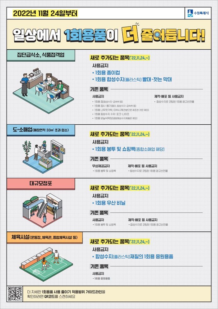 수원시는 오는 11월 23일 계도기간이 종료됨에 따라 유동 인구가 많은 구별 주요 상권을 중심으로 일회용품 사용규제 품목과 준수사항을 홍보하고 위반사항 여부를 점검할 예정이다.