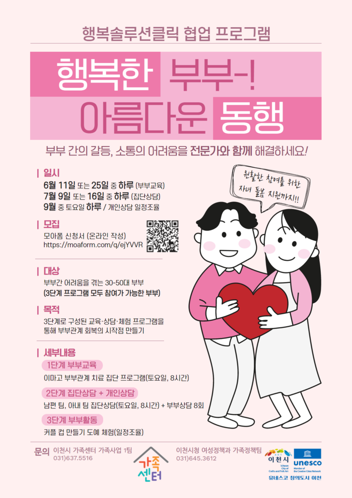 부부교육, 집단상담, 부부 활동의 3단계 프로그램과 8회기의 개인 상담을 모두 참여할 수 있는 이천시민이라면 누구나 참여 가능하며, 신청 접수는 다음 달 10일까지 온라인 신청서(https://moaform.com/q/ejYVVR)를 제출하거나 이천시청 여성정책과 가족정책팀(☎645-3612) 또는 이천시 가족센터 가족사업 1팀(☎637-5516)으로 문의하면 된다.