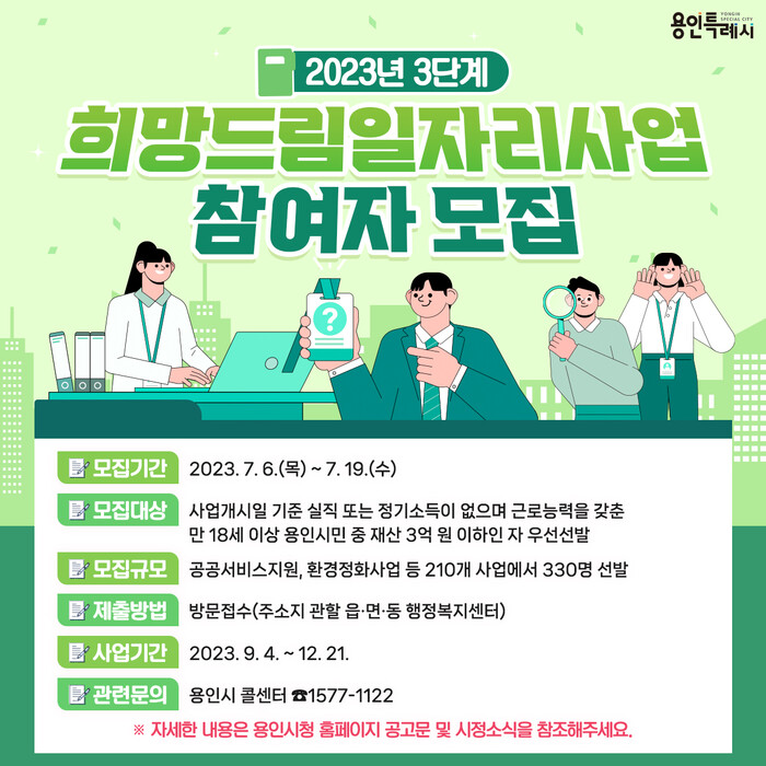용인특례시(시장 이상일)가 6일부터 19일까지 '2023년 3단계 희망드림 일자리' 사업 참여자 330명을 모집한다고 5일 밝혔다.