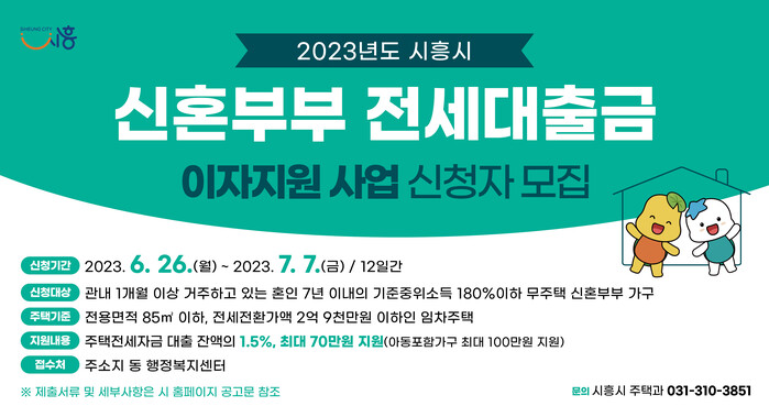 시흥시(시장 임병택)는 1일부터 신혼부부 가구를 대상으로 하는 ‘2023 신혼부부 전세대출금 이자지원 사업’을 시행한다.