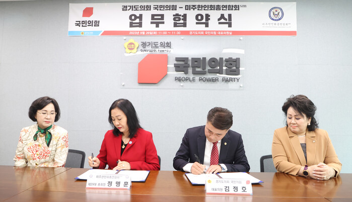 경기도의회 국민의힘(대표의원 김정호)과 미주한인회총연합회sm(총회장 정명훈, 이하 미주총련sm)가 26일 경기도의회 국민의힘 대표의원실에서 업무협약(MOU)을 체결했다.