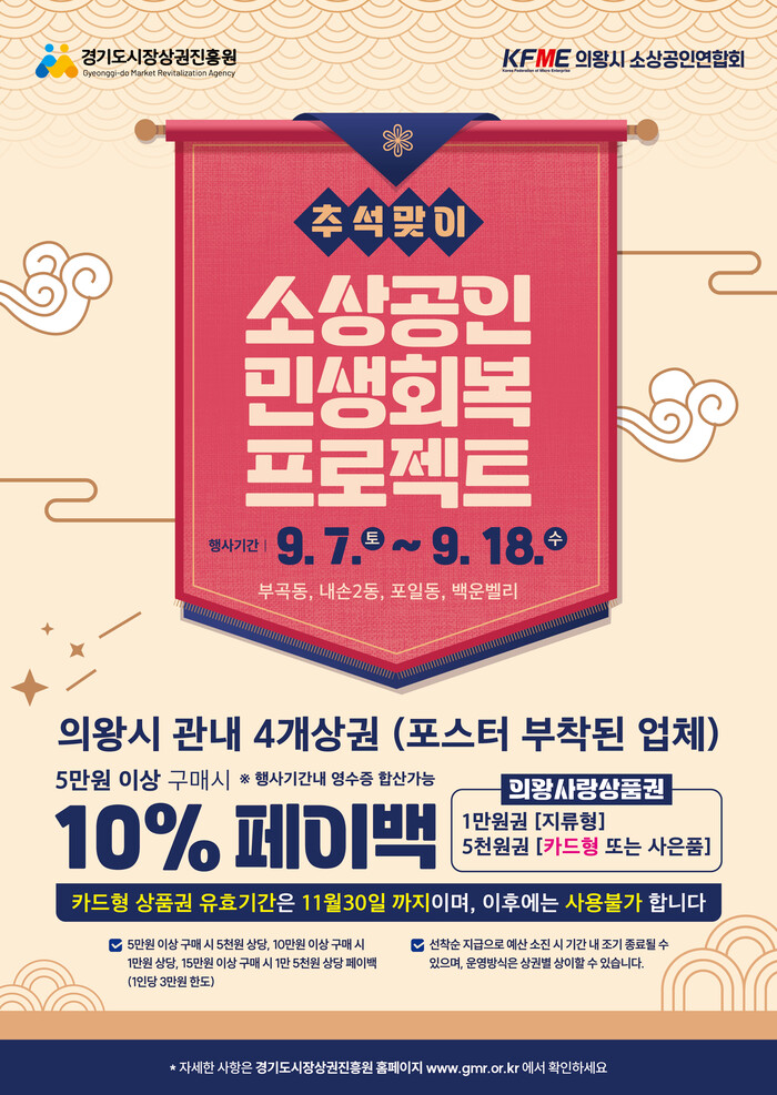 의왕시소상공인연합회 및 5개 상인회는 추석을 맞아 소상공인 민생회복 프로젝트 ‘10% 페이백’ 행사를 18일까지 진행한다.