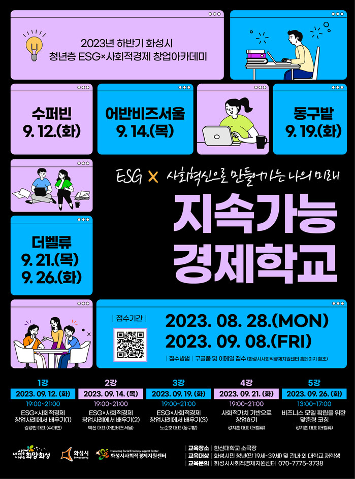 특히, 하반기 신설된 ‘지속가능경제학교과정’은 관내・외 대학교 재학생 및 만 19세부터 39세까지의 청년층을 대상으로 한신대학교 소극장에서 9월 12일부터 26일까지 5회차로 진행된다.