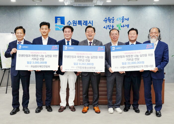유통상생연합 소속 단체 관계자들은 12일 수원시청을 방문해 이재준 수원특례시장에게 기부금을 전달했다. 나눔경매 수익금 전액은 저소득층 시민들을 위해 사용할 예정이다.