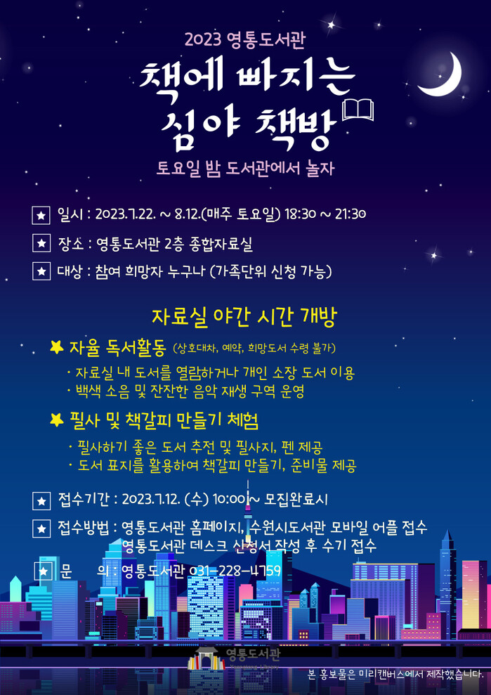 수원시 영통도서관이 7월 22일부터 8월 12일까지 매주 토요일 ‘책에 빠지는 심야 책방’을 운영한다.