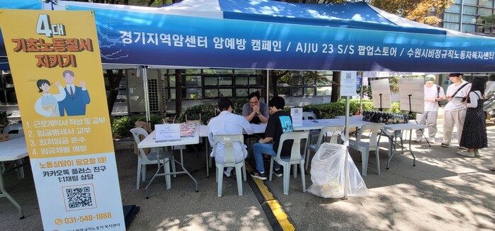 수원시비정규직노동자복지센터 직원들은 아주대 성호관 앞에서 4대 기초노동질서를 주제로 ‘노동법 O,X’ 퀴즈 행사를 진행하고, 참여자에게 노동수첩과 음료 모바일쿠폰을 증정했다. 또 4대 기초노동질서를 지키는 ‘일자리 착한가게’를 모집하고 홍보했다.