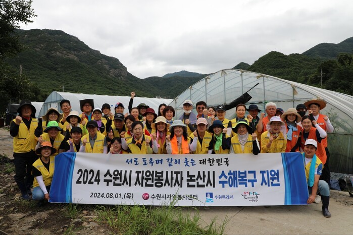 수원시자원봉사센터와 자원봉사자들은 1일 비 피해지역인 자매도시 충남 논산시에서 재해 복구작업을 펼쳤다.